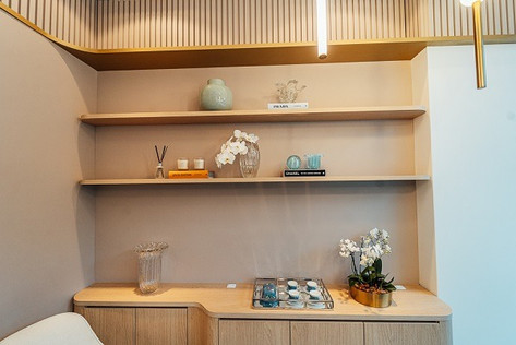 Logo na recepção, em ponto estratégico, a dupla utilizou pendentes com uma geometria única, que pode ser visto ao longo das ruas que dão acesso ao local. “Criamos uma composição entre linhas retas e curvas, que podem ser notadas no balcão de atendimento, nas prateleiras e no aparador, com design desenvolvido pelo escritório.